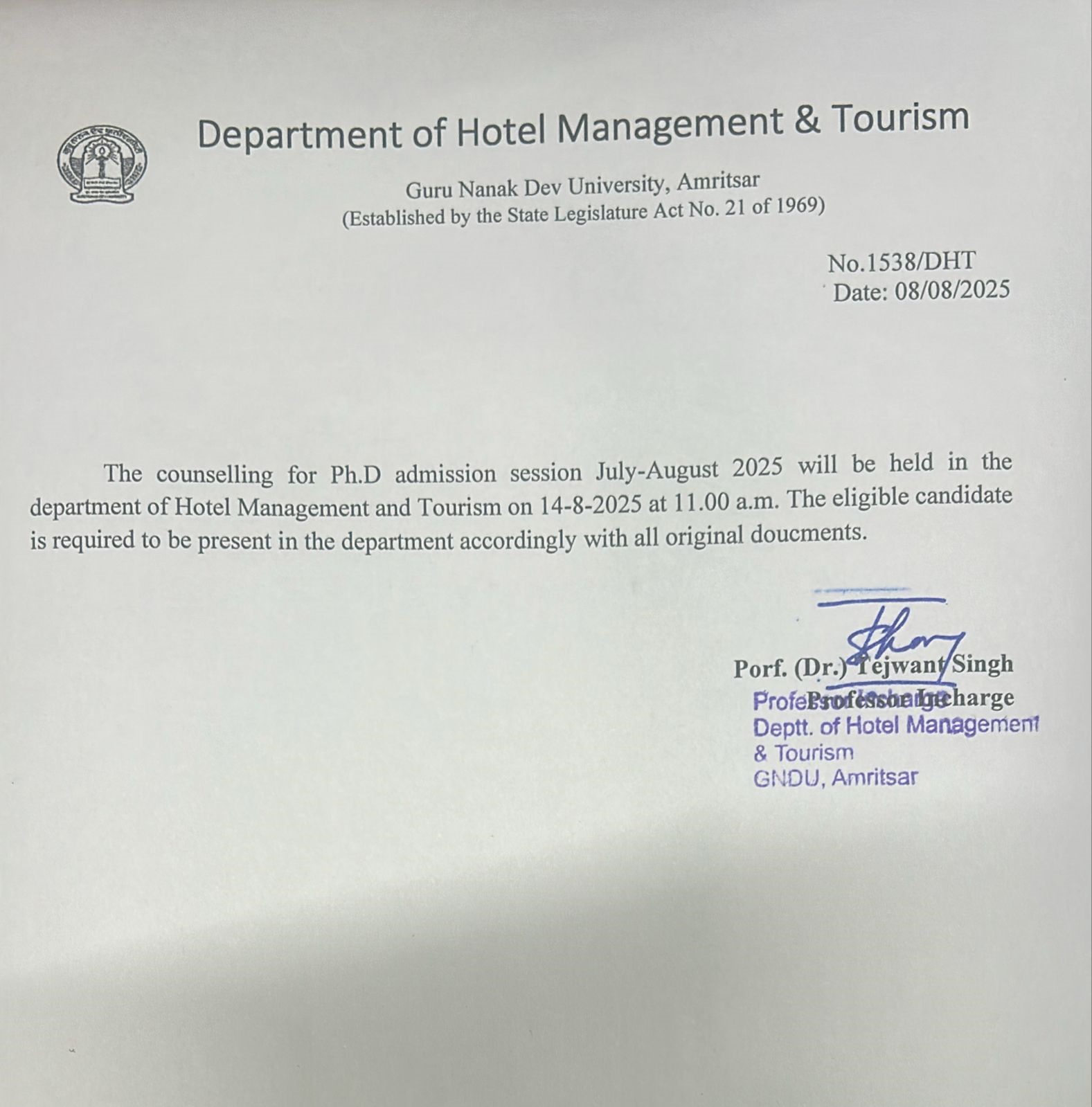 Counselling Schedule for Ph.D. admission in the Department of Hotel Management and Tourism. |