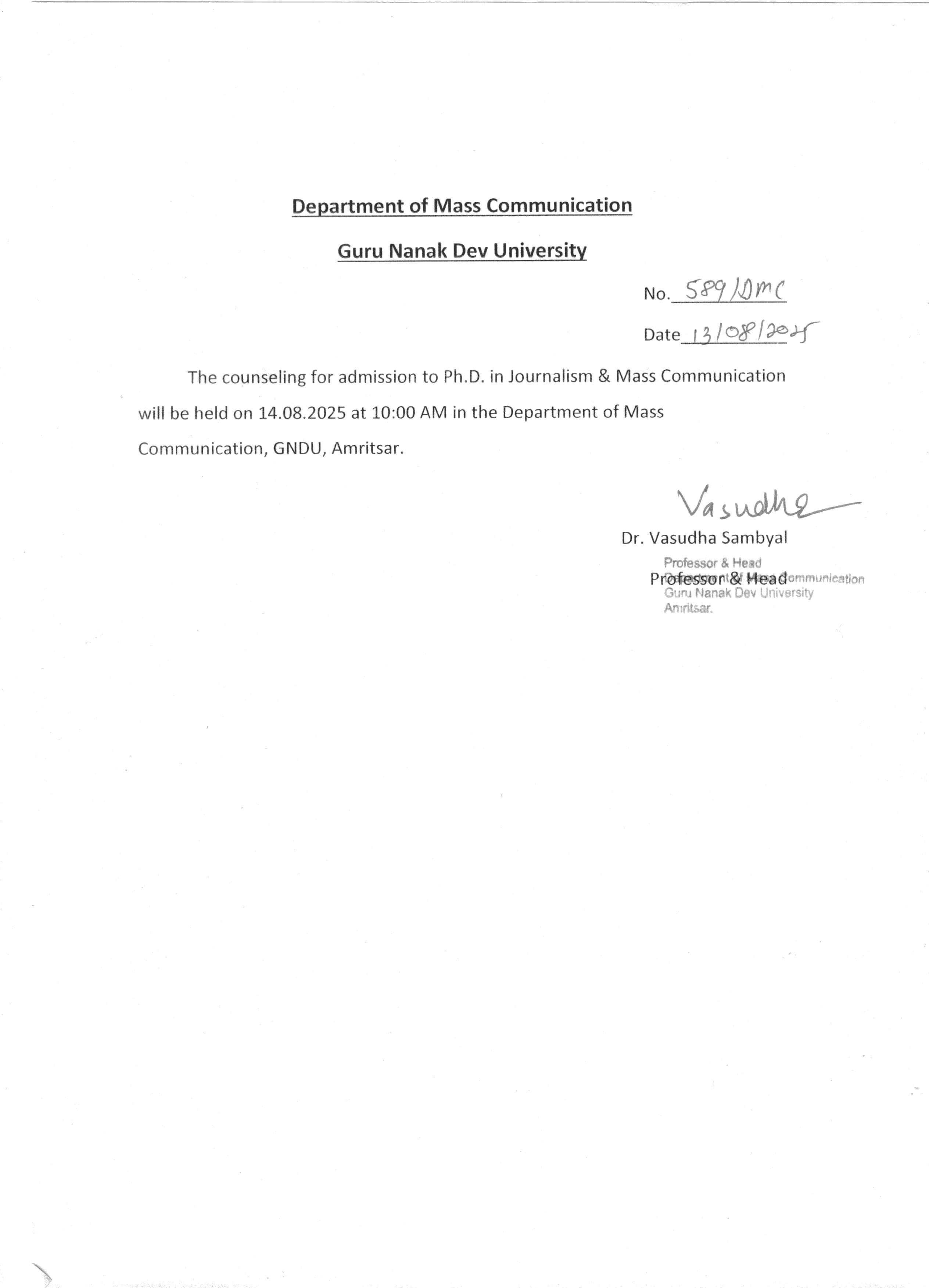 Counselling Schedule for Ph.D in the Department of Mass Communication. |